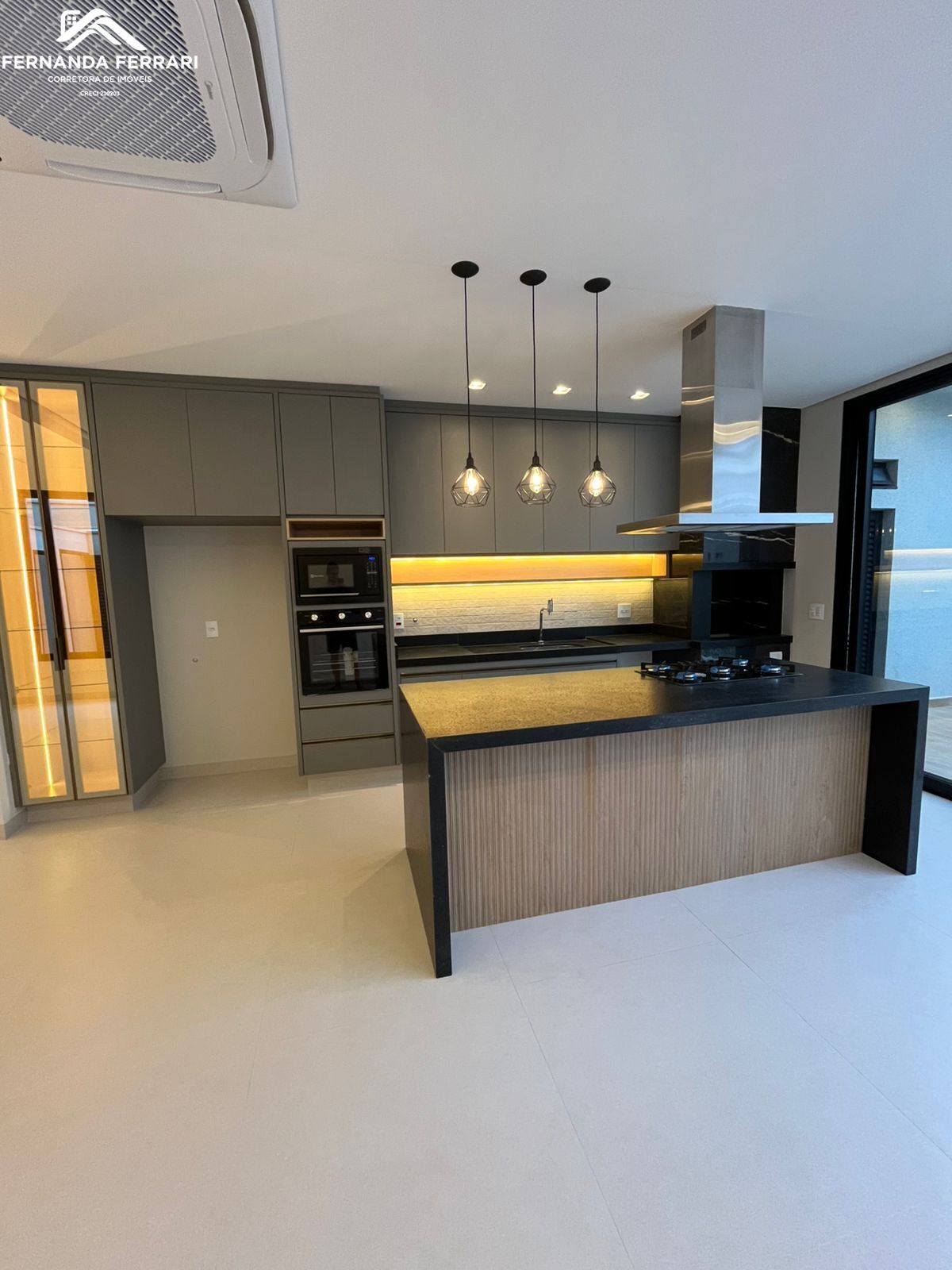 Área gourmet com cooktop, forno, microondas e ar condicionado;